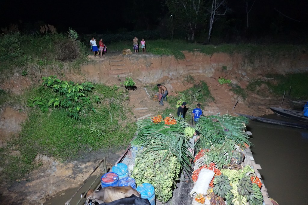 The first day was new to us so we didn’t really know what to expect. What happened was the boat continued to stop again and again to pick up random jungle river farm-based things. For example, at the first stop we collected some plantains, fairly quick, and easy. The second stop we picked up more plantains, a lot more plantains, some pigs and some chickens. What’s basically happening is these boats that make this journey stop at any farm along the river that signals them. But only if the boat wants too. Once there, the team decides if they want to buy the produce from the farm owner and then takes the stock. Once we arrive fully loaded in Iquitos, the boat will sell everything within about 1 hour of docking. The plantains are roughly bought for 10 soles a branch (with 50 plantains approx.) and sold for about 25 soles once in the city.